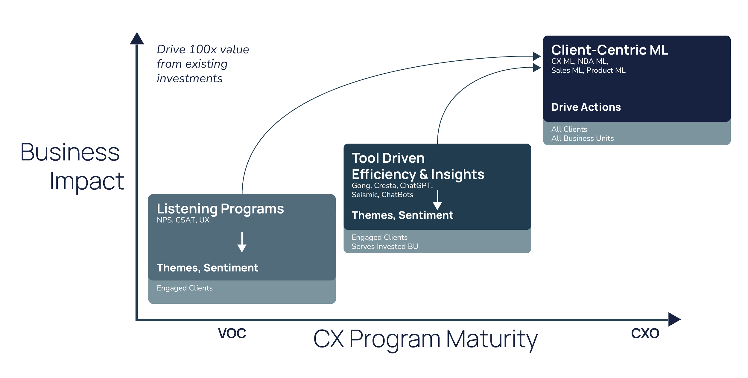 Each piece hinting at what's on your clients' minds. But despite these insights, leveraging client insights to drive large-scale impact across your company and entire client base feels nearly impossible given the lack of actionability of the insights. Answering straightforward questions, like “Why did our client satisfaction scores change?” often requires significant deep-dive efforts.